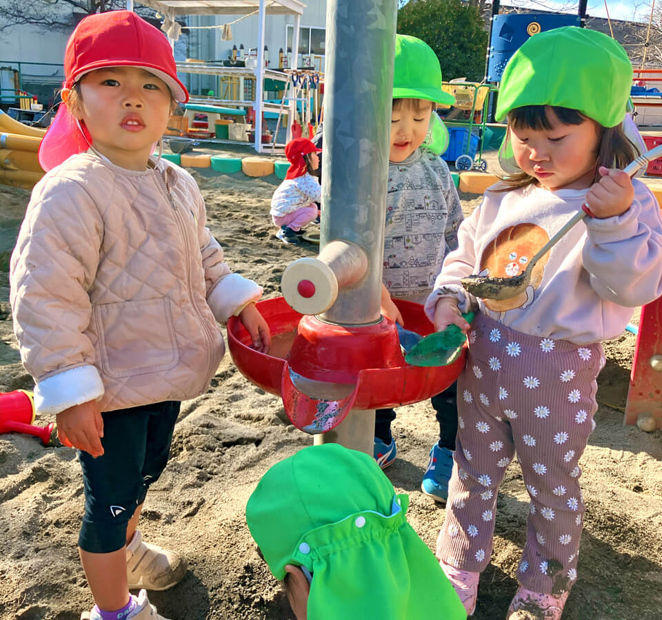 今年の冬も昨年同様、暖冬となり、上着が無くても遊べる日があるほどです。園庭に出ると様々なクラスが混ざり合って遊べるので、自然と異年齢児との交流も増えていきます。別紙のおたよりで以上児クラスに向けて来年度の保育についてお知らせさせて頂きましたが、異年齢児との交流が増えることで、子ども達の関わりや遊びの幅が広がり、年上の子がお世話をしたり、年下の子が真似してみたりと子ども達の成長に大きく影響します。意識的に異年齢児との交流を増やし、来年度の保育移行に向けスムーズに進めていきたいと思います。